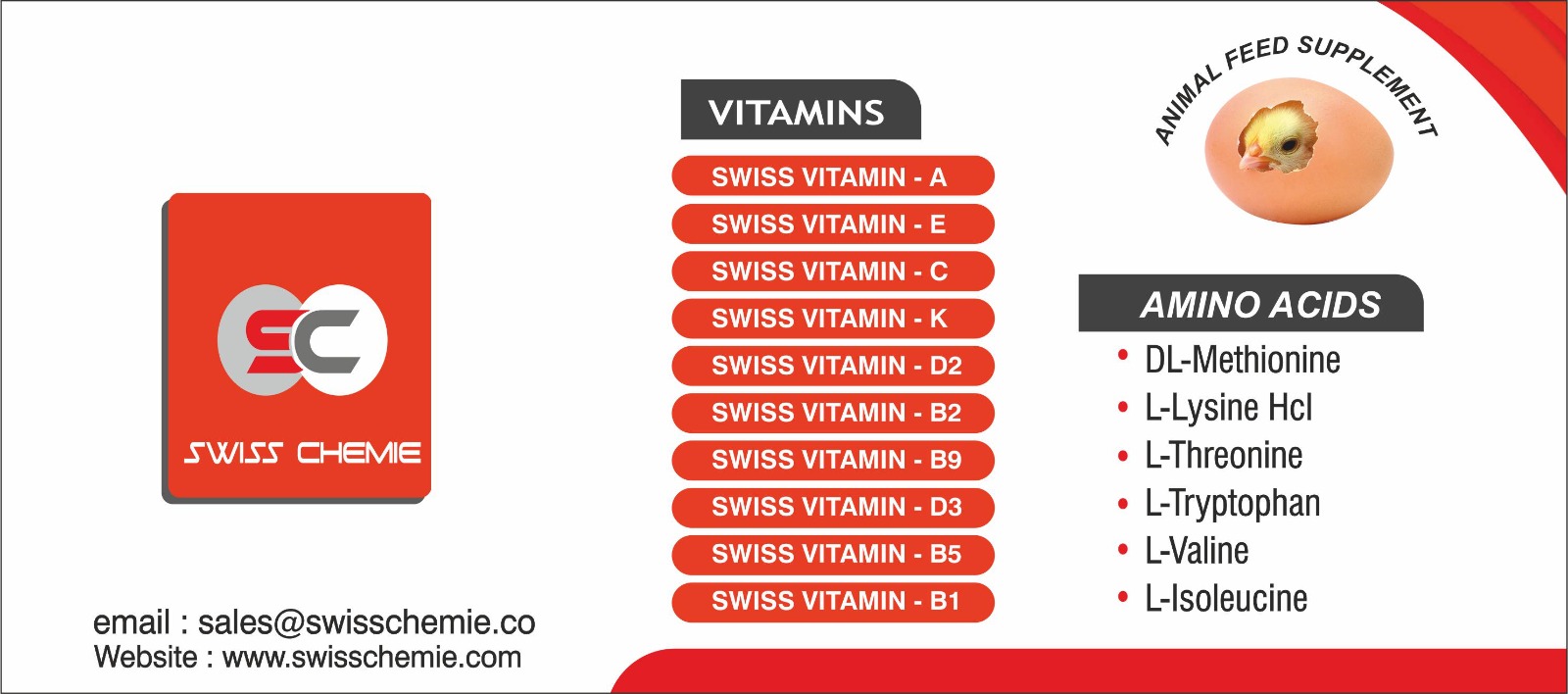 We Swiss Chemie Is One of the Leading Companies Engaged in the Manufacturing and Supplying of Fine encapsulated Animal Health & Feed Supplements, Amino Acids, Vitamins, Etc. We Are Providing a Premium Quality Range of Livestock & Poultry Feed Grade Products to Our Valued Customers Which Consist of Lysine, Methionine, Threonine, Tryptophan, Leucine, Alanine, Citrulline, Arginine, Glutamic Acid, L Leucine, L Glutamine, Betaine Hcl and Valine.